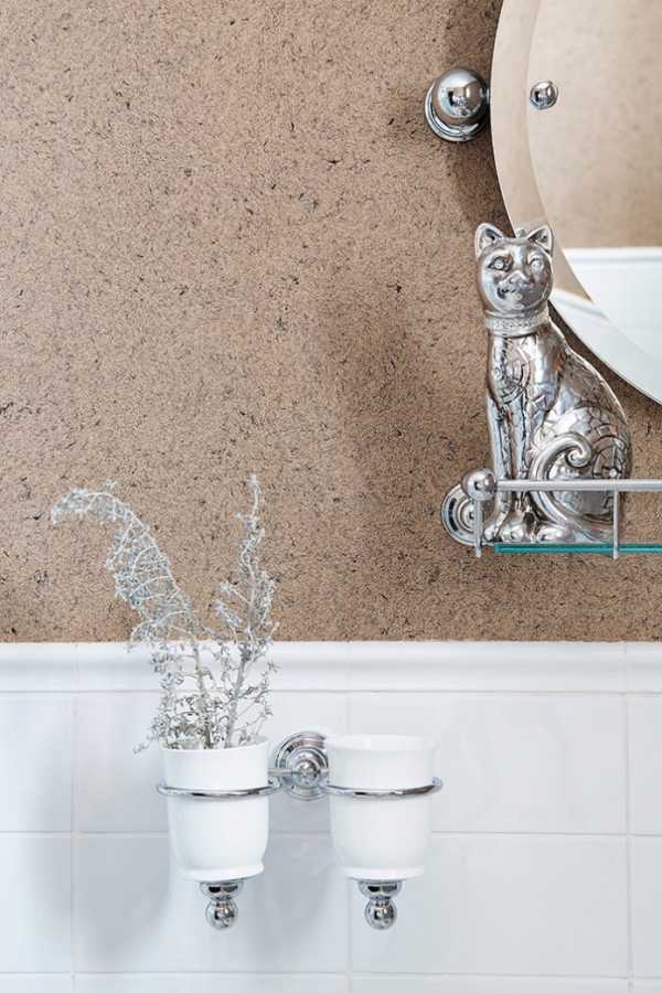 Для жидких обоев поверхность нужно отшпаклевать и загрунтовать. После нанесения обоев дать им просохнуть и нанести защитный слой лака на основе акрила. Вкрапления блесток и шелковых нитей придадут стенам маленького туалета интересный вид.