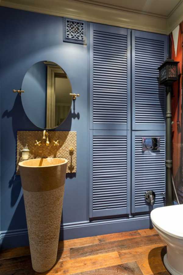Синий популярен в совмещении с голубым, белым, изумрудным, черным цветом. Синими могут быть плитка, унитаз, подсветка.