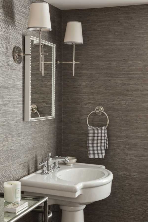На фото отделка стен виниловыми обоями в темном и светлом оттенке, которые подчеркивают интерьер маленького санузла в классическом стиле.
