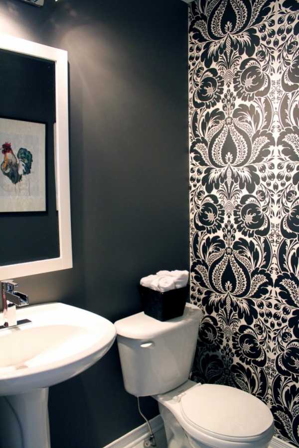 На фото дизайн туалета в черно-белом цвете. Отделка выполнена обоями с крупным узором.