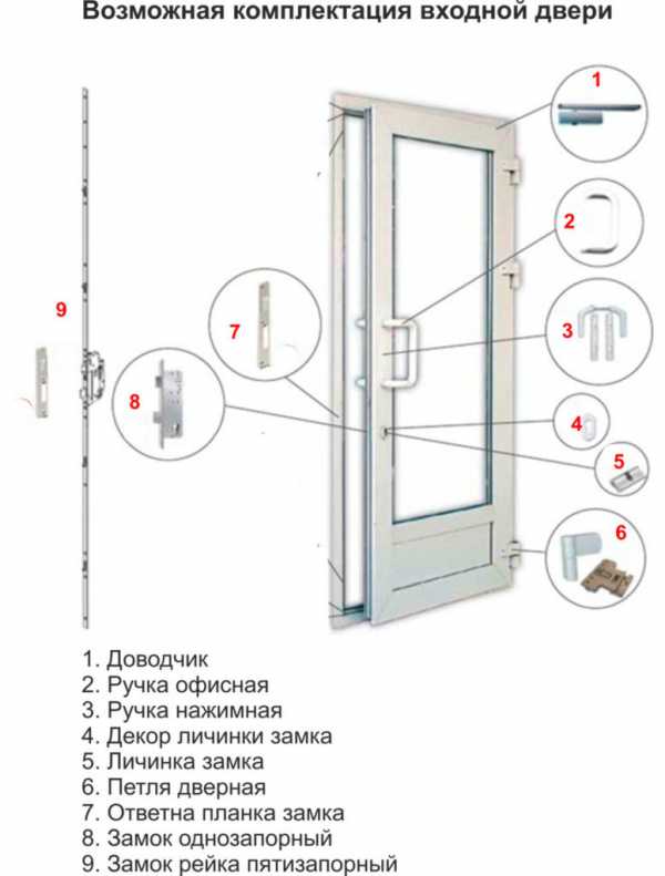 Устройство входных алюминиевых дверей включает несколько элементов: