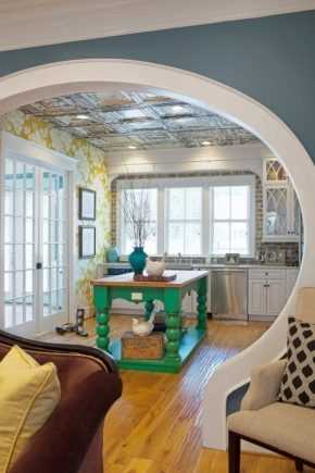 - Довольно часто в жилых помещениях встречаются кухонные арки. Вероятнее всего, это вызвано тем, что устанавливать дверь в кухню уже немодно. Нечто подобное реализуется в квартирах-студиях, когда гости могут беспрепятственно перемещаться между гостиной и обеденной зоной.