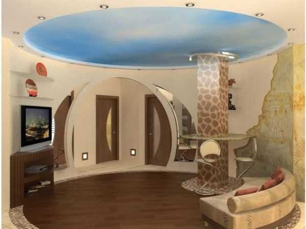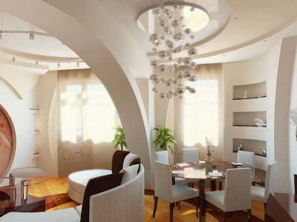- Потолочные арки или как их еще называют арочные потолки стали популярны в последнее десятилетие. Это такие конструкции из гипсокартона, которые могут принимать любой облик проема. Если готовые решения изготавливаются на заводе, то арки из гипсокартона сооружаются на месте. Таким образом, воплощаются оригинальные задумки дизайнеров или хозяев помещения.
