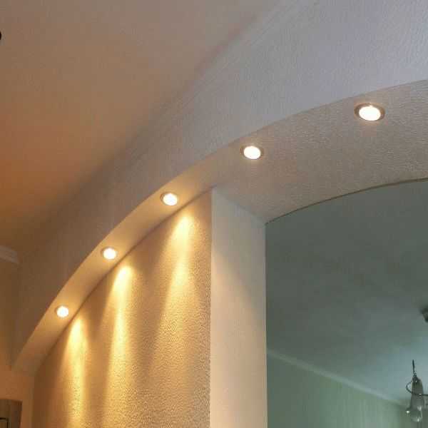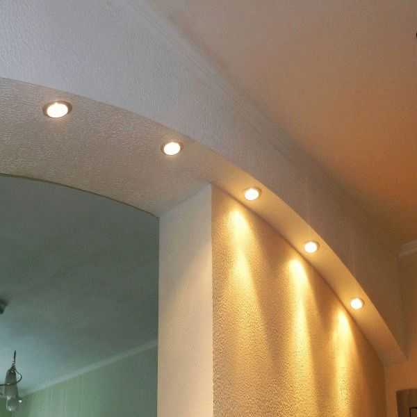 Немаловажным фактором, без которого даже изысканная арка останется просто элементом дизайна, является освещение. Интересным решением становится сочетание многоярусных гипсокартонных конструкций с различными видами освещения: точечного, светодиодного, рефлекторного и других.