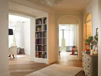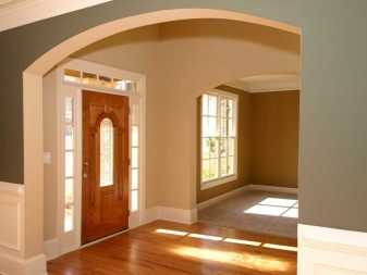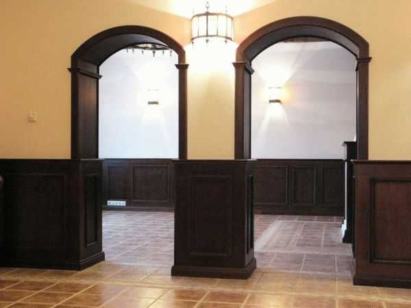 Для таких арочных конструкций свойственно использование мягких и нежных оттенков для стен, отлично контрастирующих с деревом, не только обрамляющим проёмы, но и защищающим углы от случайных повреждений.
