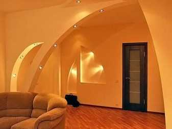 Если позволяют размеры конструкции, то дополнительно в арку можно встроить перегородки или, наоборот, сделать выступы. Оснастить арки из гипсокартона освещением тоже будет совершенно не трудно, этот материал легко режется.