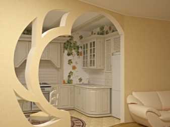 Если арочный проем устанавливается на кухню, то часть его, помимо встроенных полок, может содержать специальные металлические механизмы для удержания небольших вещей типа бокалов, кружек, кухонных полотенец, салфеток или, к примеру, небольших кашпо с цветущими фиалками. Выглядит такое устройство очень по-домашнему. Особенно для кухонь в деревенском стиле или в популярном нынче стиле прованс.