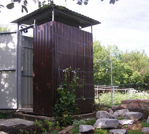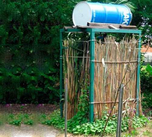 Если вода в баке покажется вам чрезмерно горячей, то отдельно можно установить емкость с прохладной водой в теневой части душа. Выведя на рожок два сопла можно регулировать температуру под себя и даже в жаркий полдень принимать душ комфортной температуры, не обжигаясь, но и не замерзая.