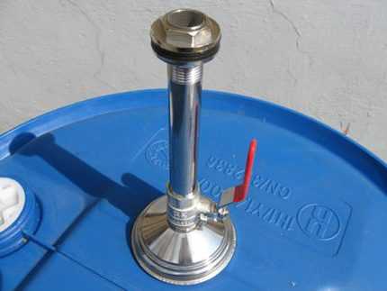 Запорный кран с патрубком под лейку душа, установленный на пластиковой бочке и готовый к эксплуатации. Концевая часть патрубка выполнена с учётом быстрого съема лейки. Кран закреплен на бочке с использованием жестких шайб большого диаметра. Такой подход обеспечивает надёжность врезки