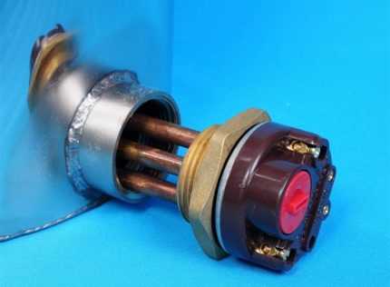 Если использовать нагревательный элемент от электрополотенцесушителя, то он позволит нагревать воду в большом количестве. Нагреватель необходимо разместить около дна, но не прижимать его к стенке бака. Греющий элемент всегда должен находиться в воде, о чем необходимо подумать заранее.