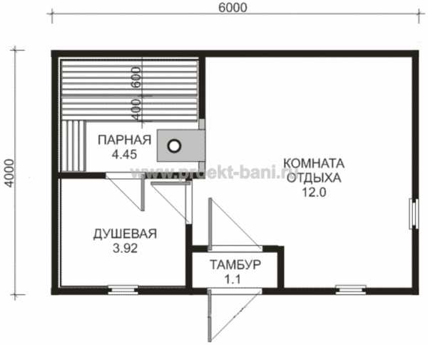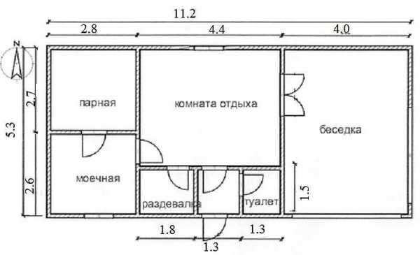 Традиционно в бане есть три помещения: парилка, моечная, комната отдыха. Если размеры участка позволяют, то рекомендуется сделать отдельный тамбур, он защитит комнату от сквозняков, а также пригодится для хранения обуви, верхней одежды, дров и других хозяйственных принадлежностей.