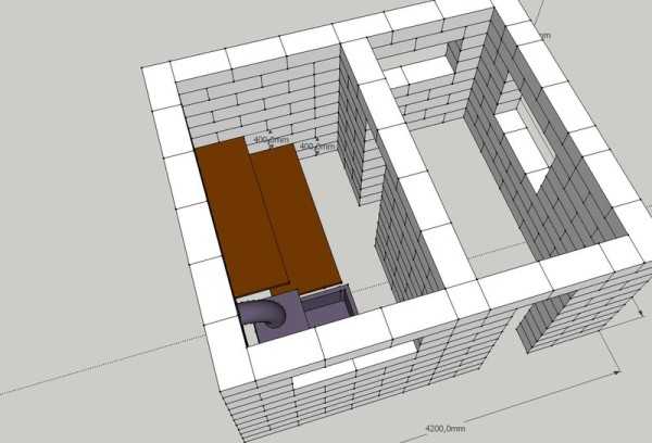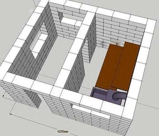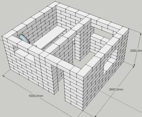 Учесть все нюансы этого материала желательно еще на стадии проектирования. Так, в интернете можно найти большое количество различных фото проектов бань из пеноблоков, но мы остановимся на одном из них размером 4200 × 3600 мм. В связи с тем, что вес пеноблока относительно небольшой фундамент под его основание можно закладывать не очень широкий. С учетом того, что строение будет одноэтажным, ширины фундамента в 30 см будет достаточно. Главное, что необходимо учесть — это глубина промерзания почвы.