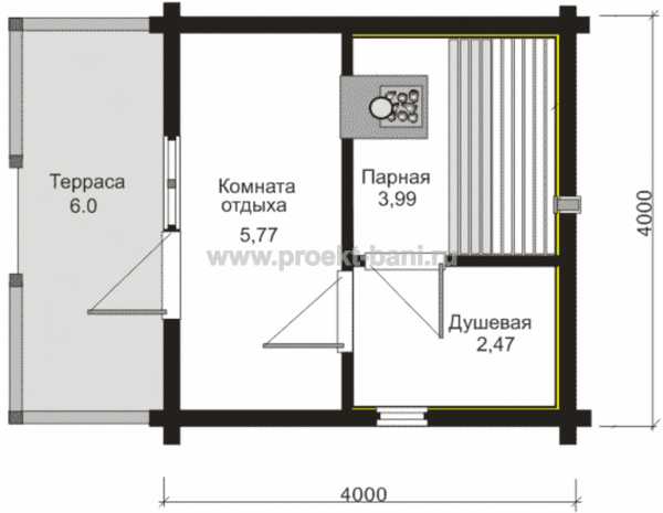 Большинство индивидуальных бань имеют небольшие размеры и рассчитаны для семьи, в отдельных случаях для двух. Представляем простые проекты для наиболее популярных размеров: от 3 х 4 до 6 х 6 метров. Чтобы просмотреть картинку — нажмите на нее.