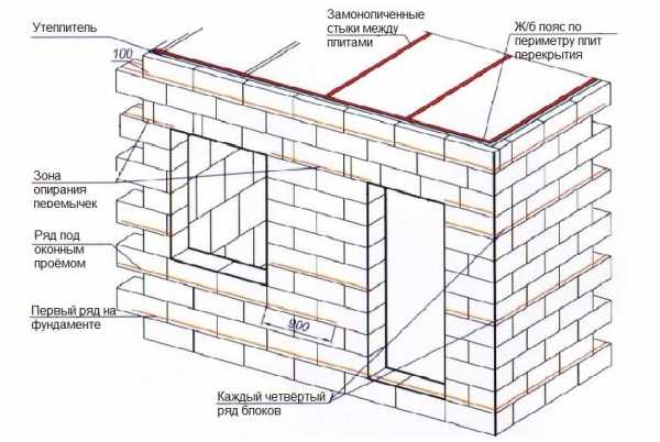 Их опирание следует производить на сплошную разгрузочную балку или мауэрлат, передающие нагрузки от них не на малую площадь отдельного блока, а на всю поверхность стены.