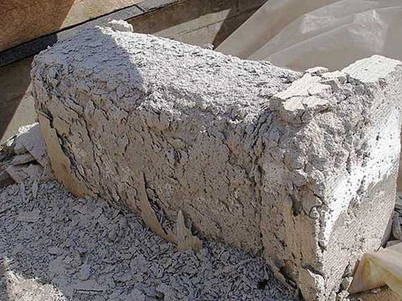 Так выглядит блок, оставленный просто на улице. В кладке, поджатый с четырех сторон соседними блоками, он держится лучше, но не намного.