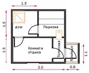 Планировки миниатюрных бань 3х3 не могут удивить большой парилкой. Минимальный рекомендуемый размер – 1,5х1,5 метра. Такие габариты позволят париться одновременно двум людям.