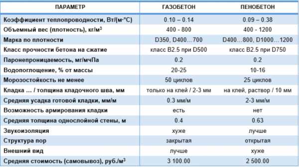 Таблица сравнения теплопроводности ячеистого бетона с кирпичом и древесиной