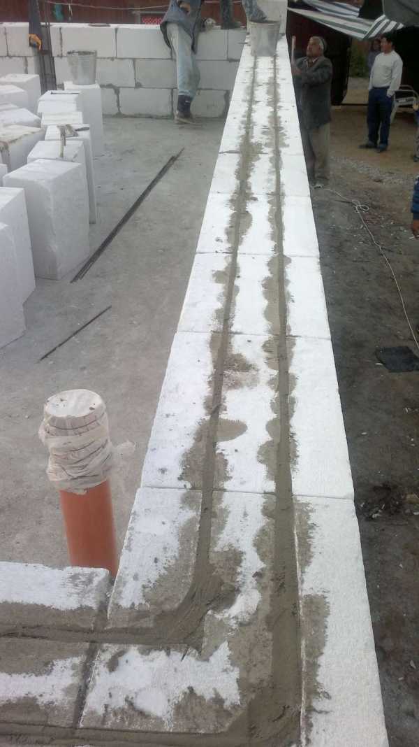 Для придания большей прочности газобетонной и пенобетонно кладке, примерно через каждые три ряда делают небольшие углубления, в которые монтируют арматуру. На уровне плитоперекрытий так же делают армирующий пояс.