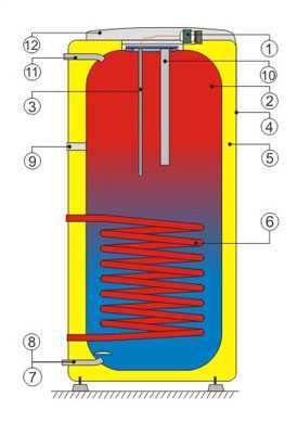 - Труба для отбора нагретой воды. Слой ее в соответствии с законами физики, располагается выше холодного слоя. По этой причине точка отбора расположена вверху.