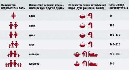 Очень важно приобрести водонагреватель с таким баком, чтобы он смог свободно обеспечить горячей водой всех проживающих в доме. Для облегчения выбора можно воспользоваться таблицей, в которой указан усредненный расход горячей воды на разные нужды. Если его умножить на количество человек постоянно находящихся в доме, получится необходимый объем бака.