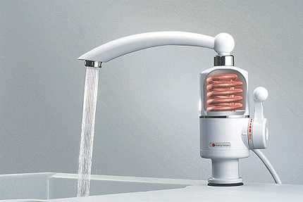 Этот тип оборудования выполняет нагрев воды, подаваемой через специальную колбу, прикрепленную к смесителю и оснащенную нагревательным элементом. Вода при помощи такого агрегата прогревается до 40 градусов С.
