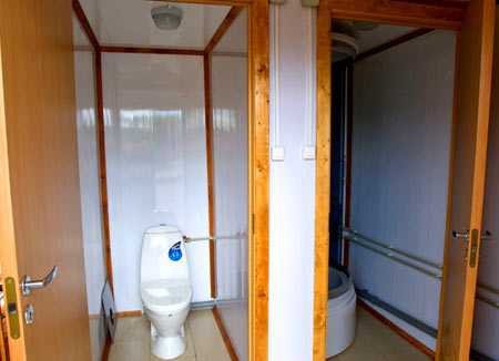 Во втором случае можно организовать полноценный туалет со всеми коммуникациями. Это сделать достаточно непросто: придется купить все необходимые материалы (а это недешево), производить земельные работы при закладке канализации. И, вообще, в этом случае работы по оборудованию туалета необходимо начинать перед доставкой и сборкой самой бытовки. Как правило, к таким мерам не прибегают и останавливаются на биотуалетах или отдельно стоящих туалетных кабинках с выгребными ямами.