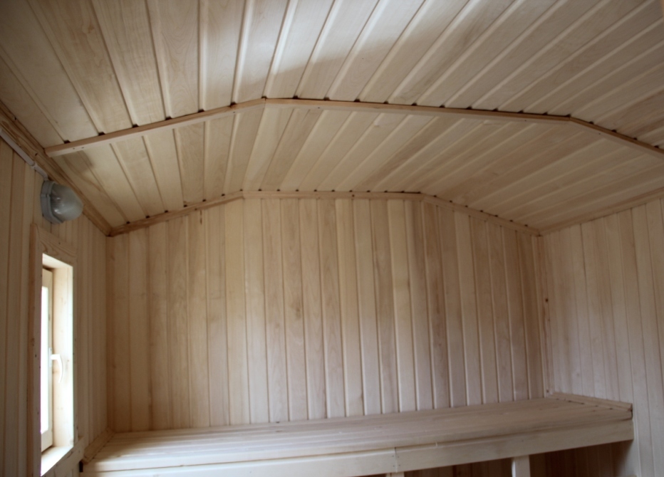 Со стороны парилки, потолок, как правило, подшивается вагонкой из древесины лиственных пород. Также приемлема обшивка из лиственницы или кедра – дорогих пород дерева, самых распространенных в отделочных работах внутреннего помещения бань.