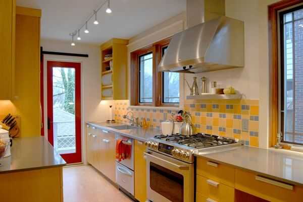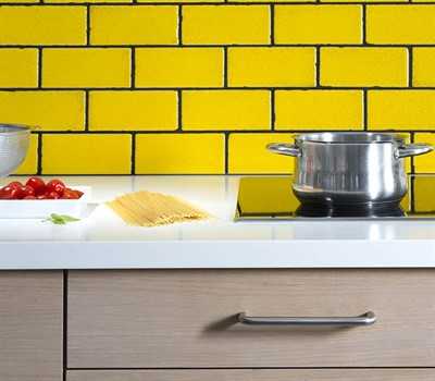 Жёлтый кухонный фартук визуально расширит пространство, являясь светлым сочным цветом. Использовать его можно как на небольшой, так и на просторной кухне.