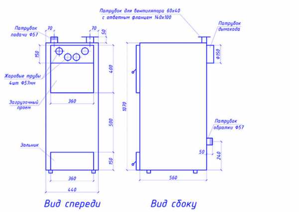 Чертеж котлаОбратите внимание! Замена активного сжигания тлением возможна ввиду особого устройства отопительного котла.