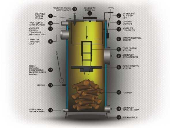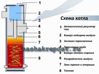 Основным элементом котла является топка, где горение ограничено, а интенсивность подачи воздуха контролируется при помощи специальных приспособлений. Топливо загружается два раза в сутки большими порциями, после чего медленно тлеет (ограниченное количество кислорода не позволяет ему полноценно гореть).
