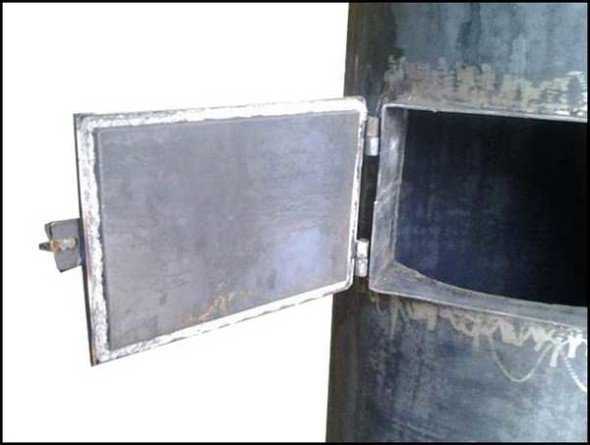 3. В нижней части корпуса болгаркой вырезают квадратный проем, через который удобно вычищать золу. Затем приваривают петли и навешивают дверцу с задвижкой.
