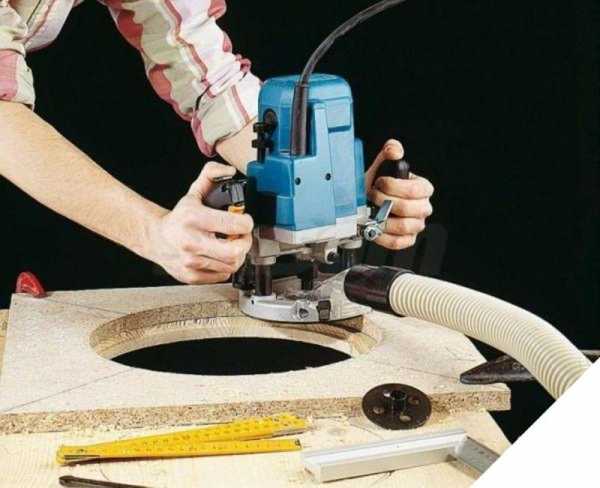 . Для малых окружностей (радиус менее 15 см) на основании оборудования предусмотрены технологические отверстия, в которые вставляется центровочный штифт на заданном от фрезы расстоянии.Выборка пазов осуществляется при помощи углового упора, закрепленного на корпусе станка под прямым углом. Прежде чем начинать работу, столяр обязан обеспечить заготовке будущего изделия неподвижное положение, ведь отсутствие надежной опоры неизбежно приведет к тому, что края паза будут кривыми, а это негативно скажется на конечном результате работы. Обратите внимание на то, что за один проход не рекомендуется снимать слой древесины, превышающий 5 мм. Достаточно глубокие пазы согласно технологии выбираются в несколько приемов. Работа ручным фрезером по дереву должна выполняться плавно, без спешки и резких движений, иначе придется столкнуться с таким неприятным явлением, как рваные края канавки.