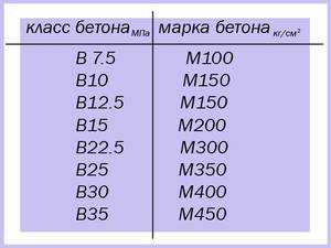 Каждый определённый класс бетона по прочности можно соотнести с маркой. Получить требуемую информацию позволяет таблица соответствий, где напротив каждого класса обозначено соответствующее ему наименование марки.
