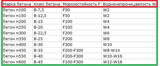 Зная марку и класс, вы сразу определите приблизительную водонепроницаемость и морозостойкость. Здесь действует простое правило: чем выше марка материала, тем выше показатели водонепроницаемости (определяется латинской буквой «W»), и морозостойкости (определяется латинской буквой «F»). В любом случае, разобраться с вопросом будет проще при помощи таблицы, в которой приведены соответствия между этими параметрами строительного материала: