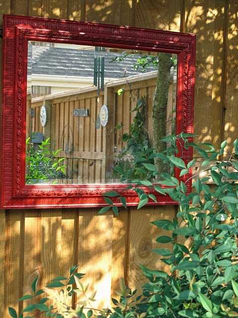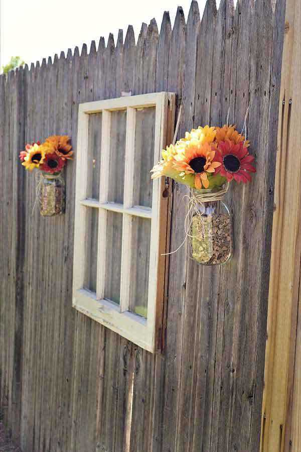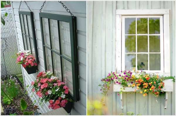 - Украшаем забор старыми деревянными рамами, создавая видимость окон в доме;