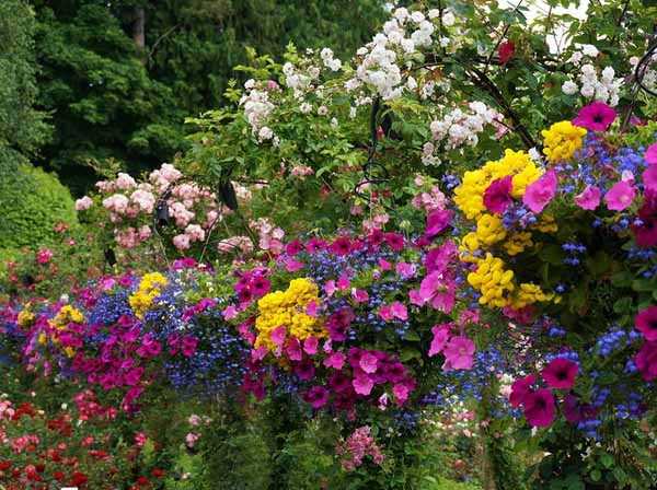 Сторонники классики могут наслаждаться чаепитиями в уголке сада, увитом розами. И для этого нет необходимости строить беседки вдоль забора и устанавливать арки. При украшении ограждений можно использовать даже жестяные банки из-под краски, кофе или консервные. Подвешенные на хомуты и окрашенные в яркие цвета, они будут прекрасным дополнением к цветочному дизайну. Расположив ненужные корзинки на фоне светлого забора и посадив в них разноцветные петуньи, можно оживить даже самый скучный пейзаж.