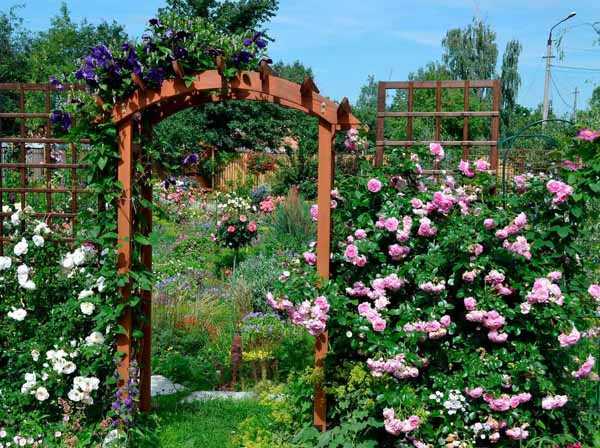 - Многолетники. Это клематисы, жимолость, девичий виноград, плетистые розы и другие растения, которые более требовательны в уходе, но, разросшись, выглядят намного эффектнее однолеток.