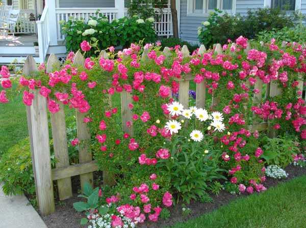 Но не только плетущиеся розы можно использовать для озеленения забора — например, кусты чайно-гибридных роз не нуждаются в опоре, но их прекрасные ветки проходят сквозь планки штакетника, создавая из забора настоящее произведение искусства.