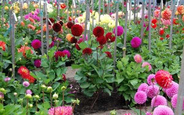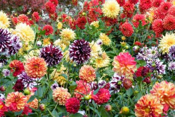Эти неприхотливые цветы для дачи самой разнообразной расцветки и формы. Они могут походить на хризантемы, на розы, на пионы. Сажают георгины ранней весной клубнями в почву, с осени сдобренную перепревшим навозом.