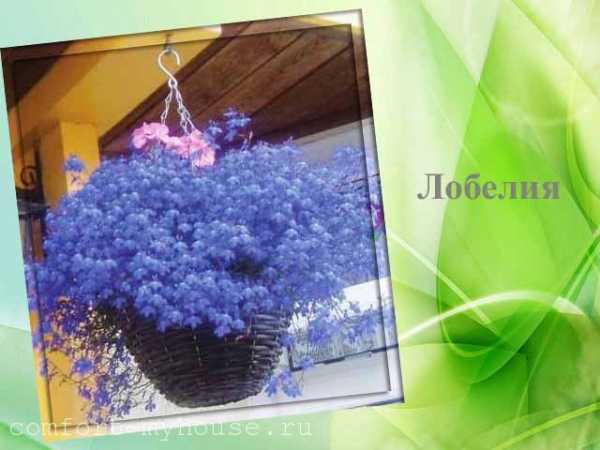 - лобелия с мелкими очаровательными цветками небесно-голубого цвета, но бывает и белая, и фиолетовая. Посадка и уход тоже подобна петунии — лобелию выращивают рассадным методом, уже в феврале высеивают мелкие семена, рассыпая поверх земли, лучше смешанные с песком. Пикируют обычно по нескольку растений вместе через месяц после появления ростков.