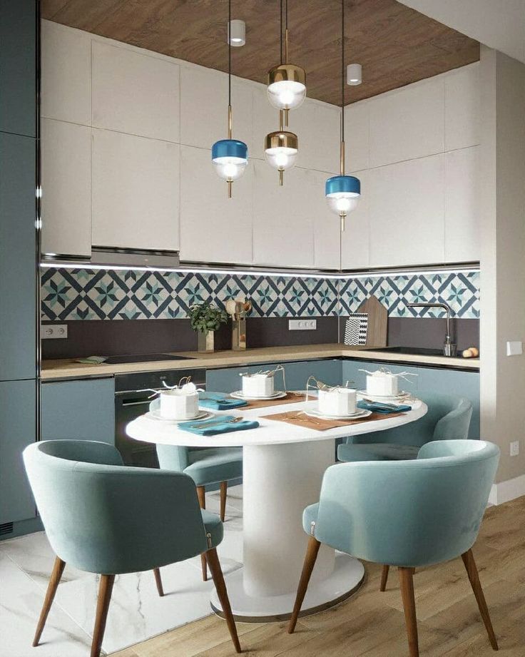 При такой пропорции пространство не будет смотреться аляповато, а глаза не устанут от ярких красок. Например: белая отделка, серо-голубой гарнитур, солнечно-желтый фартук. - Для отделки и крупной мебели лучше брать самый спокойный тон, потому что это статичные элементы интерьера. Добавить красок можно с помощью декора, текстиля или мелких предметов (светильники, стулья, табуреты) — их легко заменить.