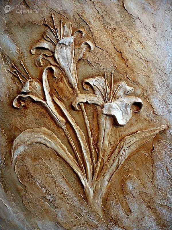 - Использование подручных средств. Для получения оригинального рельефа можно использовать любые инструменты и материалы. Достаточно взять обычный полиэтиленовый пакет и, скомкав его, прикладывать к стене. Можно взять листья, перья, куски ткани или холста и оставить их «отпечатки» на влажной поверхности. Это позволит создать неповторимую и уникальную отделку.