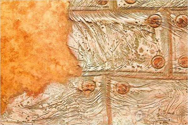 - Техника «Сграффито». Поверхность, выполненная в этой технике, имеет многослойный рисунок. Несколько слоев штукатурки разных цветов наносятся друг на друга в нужной последовательности. На верхнем слое при помощи трафарета намечается рисунок, и в нужных местах удаляются слои материала, пока не будет достигнут слой с нужным цветом.