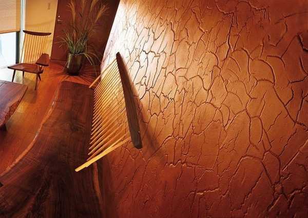 - «Древесная кора». Имитация коры получается при разглаживании штукатурки валиком с меховой шубкой. Для дополнительного эффекта после высыхания стену нужно отшлифовать и покрыть лаком с помощью такого же валика.