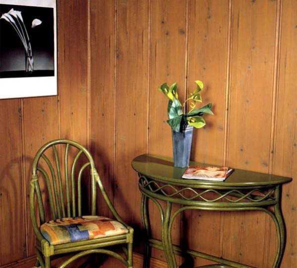 - Относительно дешевым продуктом являются панели декоративные под дерево, изготовленные из ДСП (фото). Однако нужно учитывать, что в производстве этой разновидности отделочного материала используют формальдегидные смолы, поэтому использование его в жилых помещениях крайне нежелательно. Панели из ДСП также плохо выносят влажность, температурные перепады, легко повреждаемы и сложны в обработке, а потому данная разновидность стеновой обшивки практически не пользуется спросом.