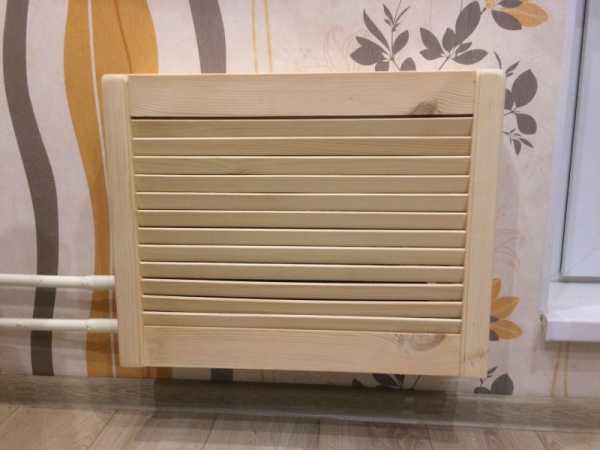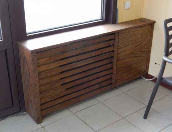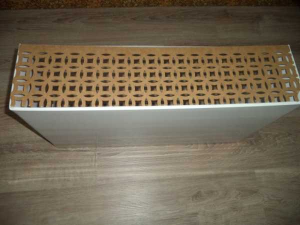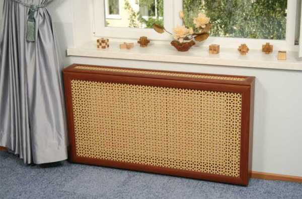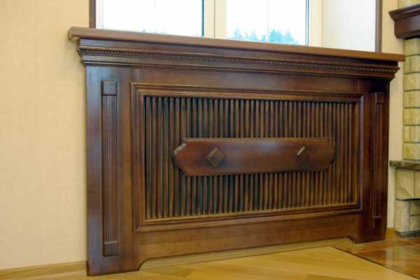 Деревянный короб на радиаторы отопленияВажно! При выборе экранов на радиаторы отопления из любых материалов обращайте внимание на их верхнюю часть: выполненная в виде вентиляционной решетки, она будет гораздо лучше пропускать тепло, чем сплошная полка.