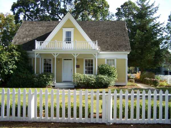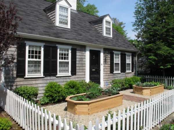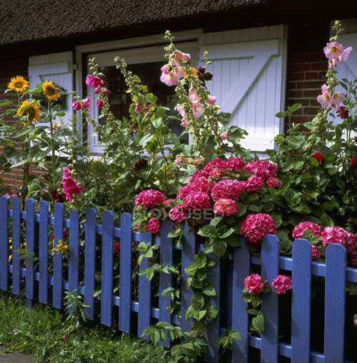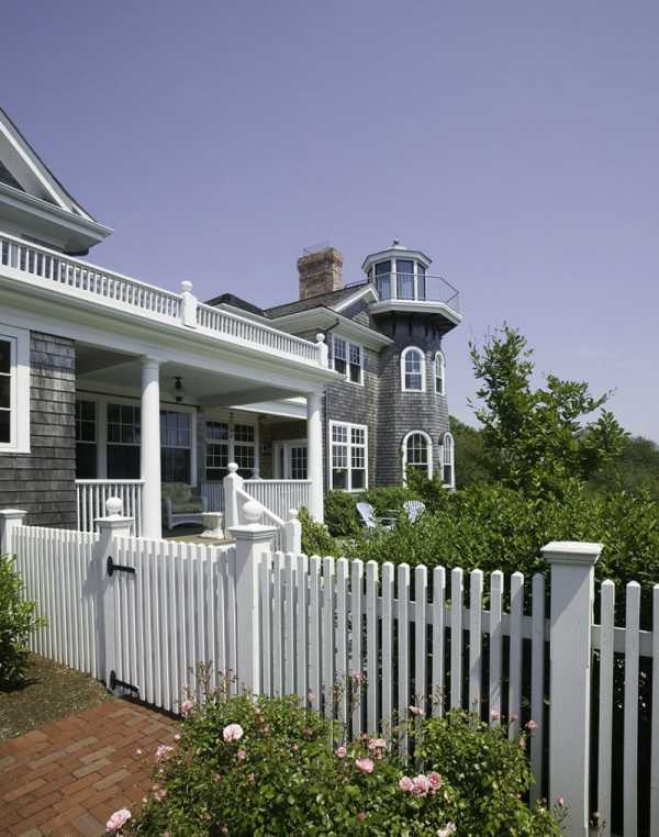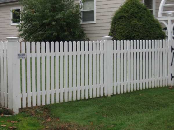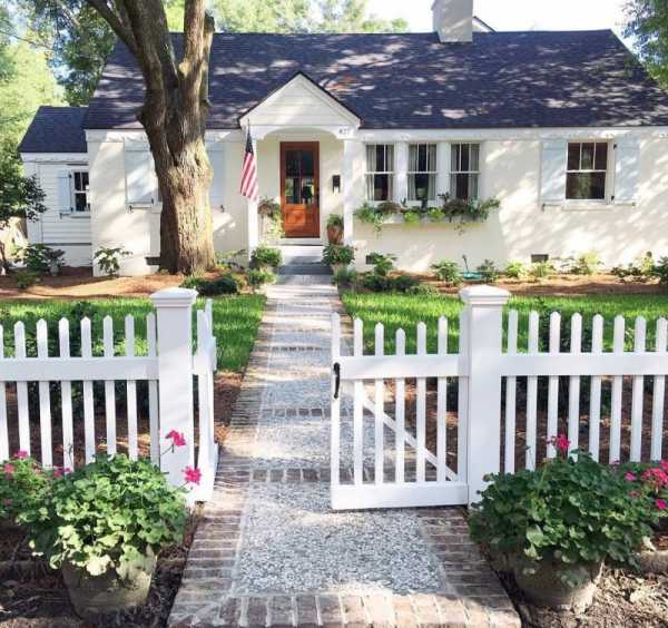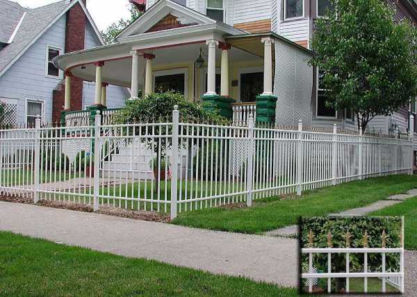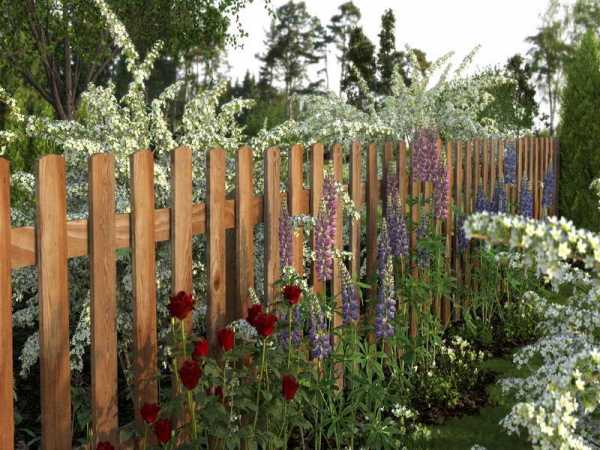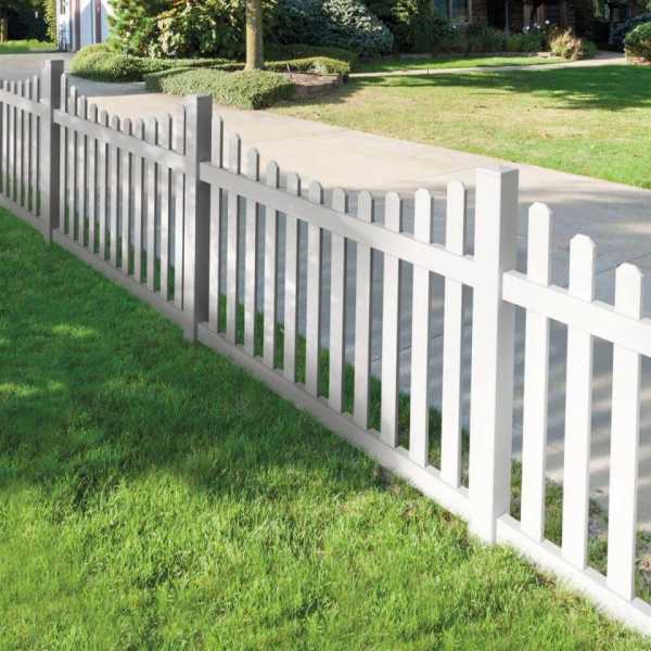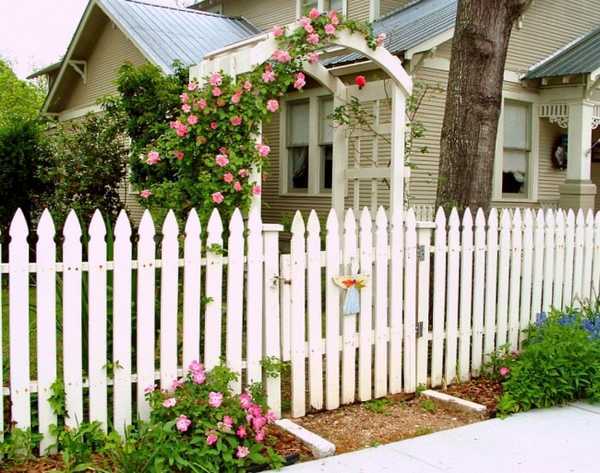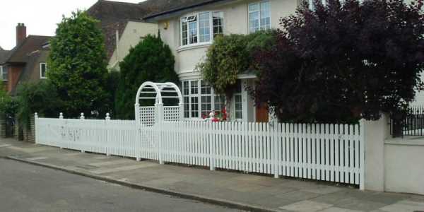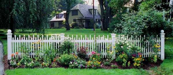 - Классический штакетник или пикет, состоящий из вертикальных реек, окрашивается в классический белый или другой цвет, может располагаться на переднем плане участка