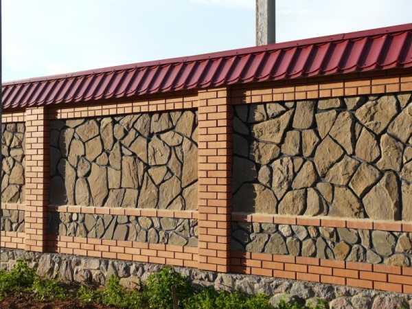 Каменный забор на даче — такие ограждения выделяются очень привлекательным дизайном. Можно брать любые камни и даже гальку. Хорошо смотрится красный декоративный кирпич для забора на даче. Материал ставят на ребро и поворачивают по диагонали относительно плоскости земли.