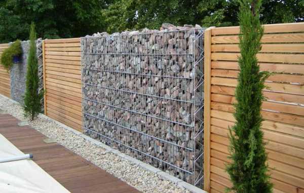 Габион — ограждение из камней в сетке- Более распространенный кирпич, который интересно смотрится на фоне дома с такой же облицовкой. Часто забор из кирпича возводится на фундаменте, что делает его прочным. Такое ограждение не требует особого постоянного обслуживания, потому что не сильно подвержен воздействию природы.