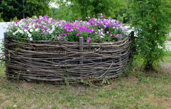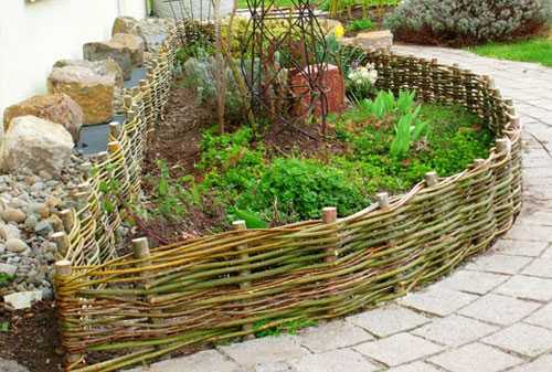 «Плетень» создается быстро и будет напоминать провинцию. Используются прутья в 2 см ивы, яблони или березы. Для них нужны высокие колья и проволока.
